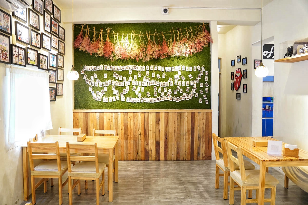另一側的花草拍照牆則以抹綠色為底,上面貼滿客人留下的拍立得回憶,讓空間充滿溫馨與互動感。