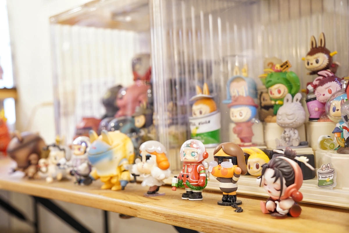 同時,店內的燈飾也相當講究,選用帶有彩繪玻璃風格的小吊燈,增添細緻美感。更有趣的是,店裡擺放了許多收藏品與公仔,配置上不會讓人覺得突兀,反而相當有條理地融入整體風格中,使空間顯得活潑卻不凌亂。