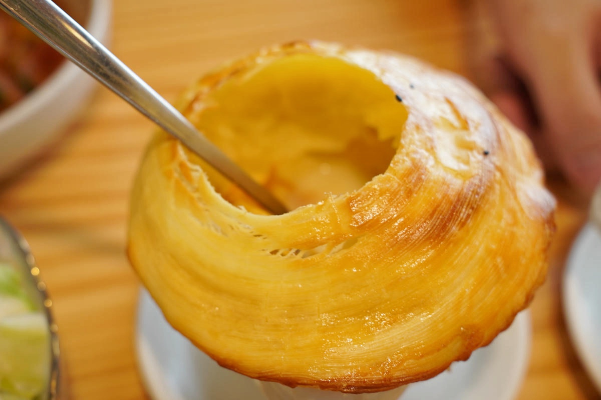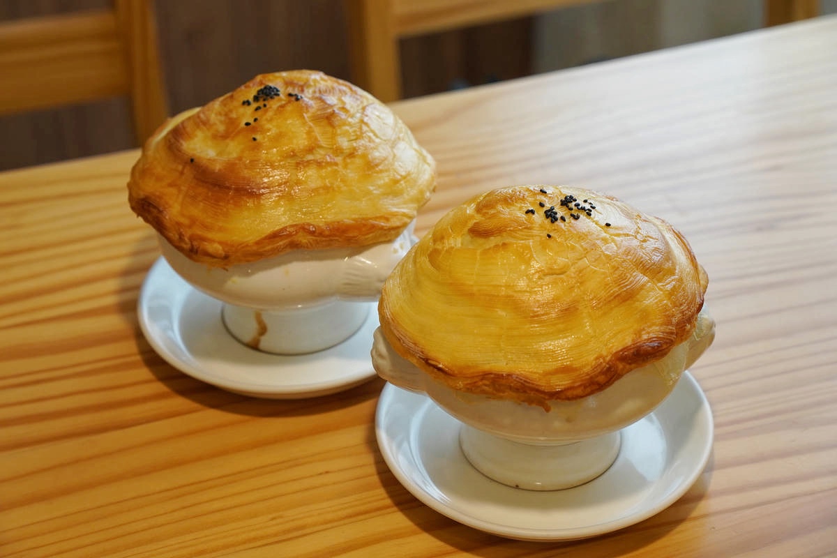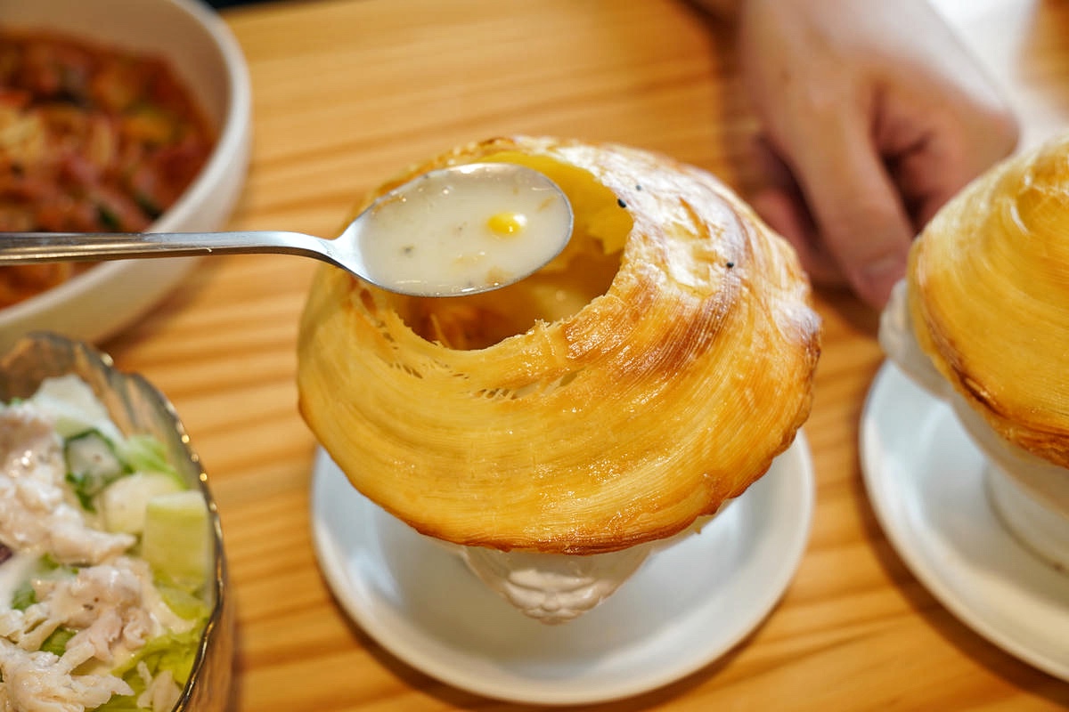 端上桌時,光是金黃蓬鬆的酥皮外觀就相當誘人,輕輕敲開酥皮,立刻就是清脆的聲響與層層烘烤酥香,吃起來非常脆口,酥皮表現得很好。