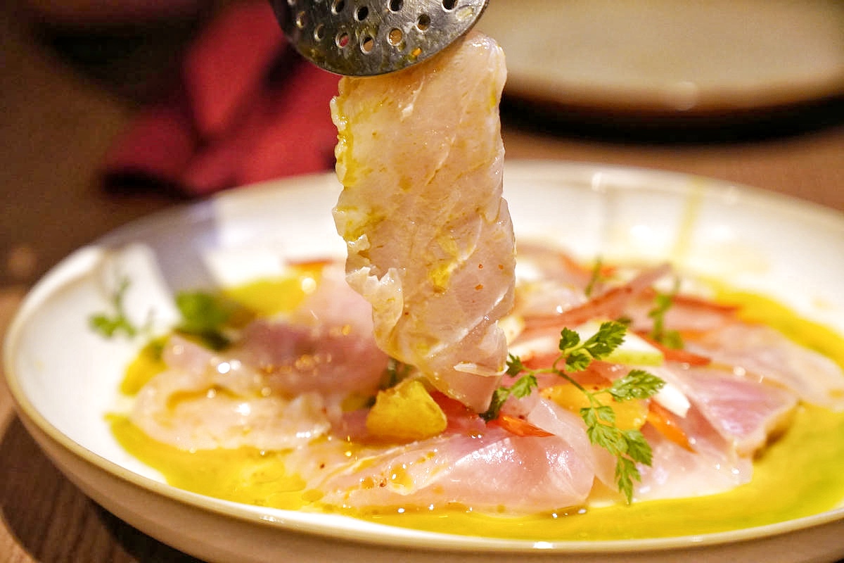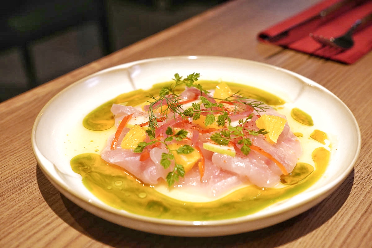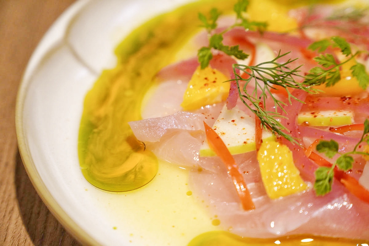 第一道菜上的是冷盤前菜「季節魚生」,使用的魚料是旗魚,魚片看起來晶瑩剔透,吃起來細緻又新鮮彈口,這道菜主廚使用葡萄柚、青蘋果、蒔蘿香料油、檸檬、醃漬辣椒搭配時蔬香草入菜,口感、香氣層次都非常豐富。將魚生和蒔蘿香料油及一眾配料均勻攪拌著食用,滋味吃來更是妙極,是一道非常棒的開胃前菜,也特別適合夏秋之際。