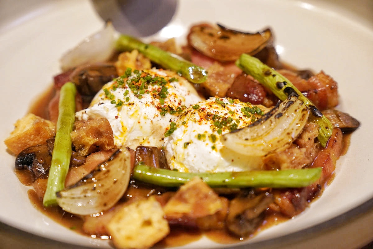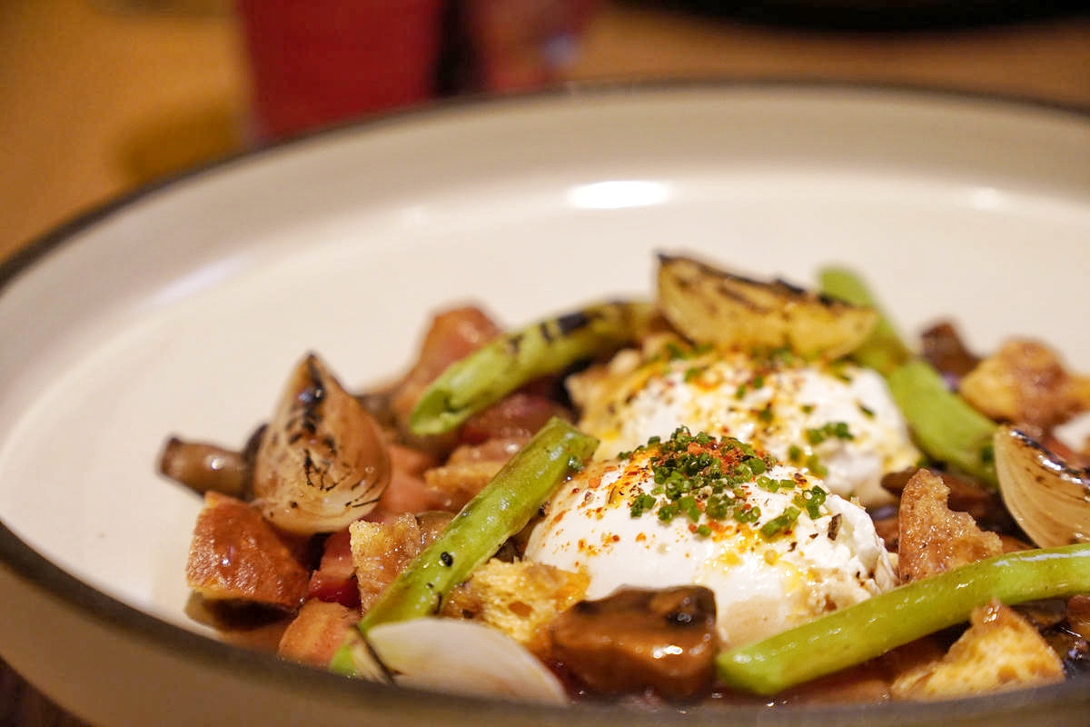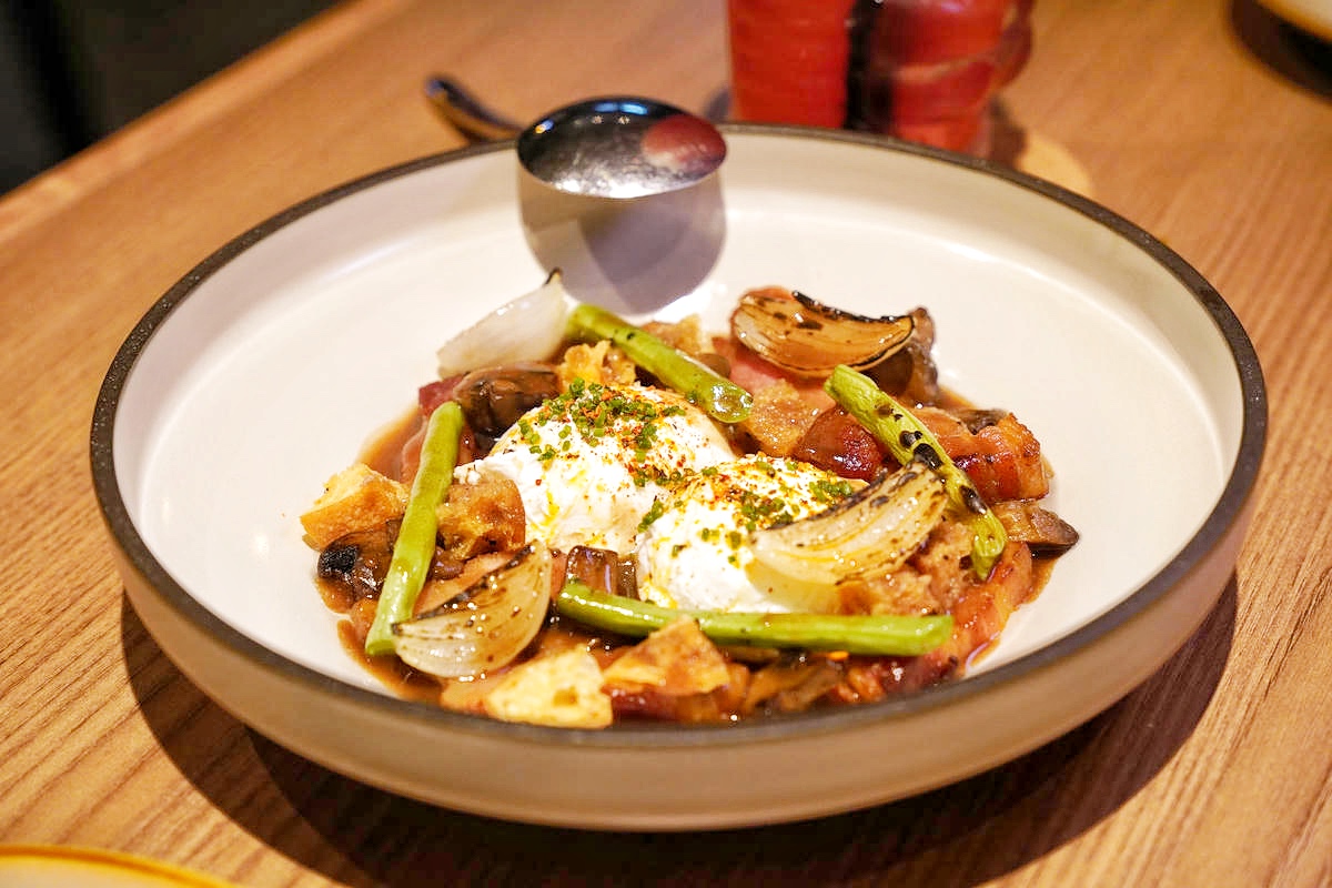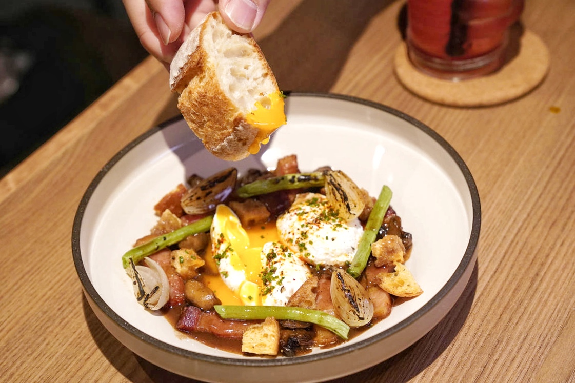 加入了勃根地紅酒牛骨醬,並以培根、麵包丁、洋菇、洋蔥等配料加以燉煮,嚐起來濃厚中帶點微酸香。中間的嫩滑水波蛋當然也是主角之一,用刀輕輕劃開,柔軟濃稠的蛋黃溢出,畫面實在療癒,沾取一旁的濃厚紅酒醬汁一同入口,是令人感動的滋味。
