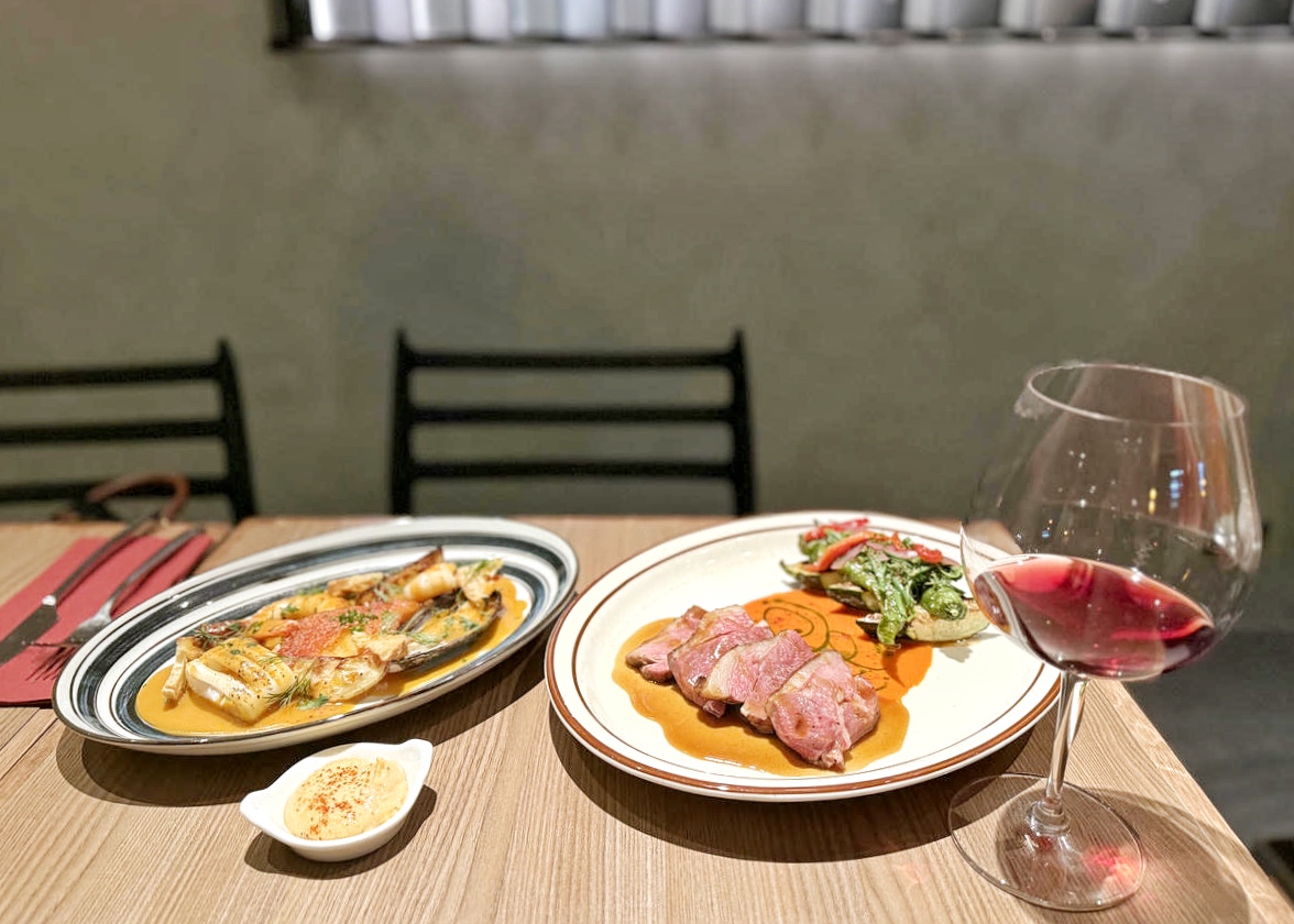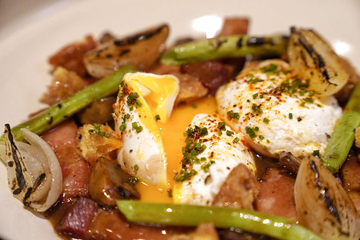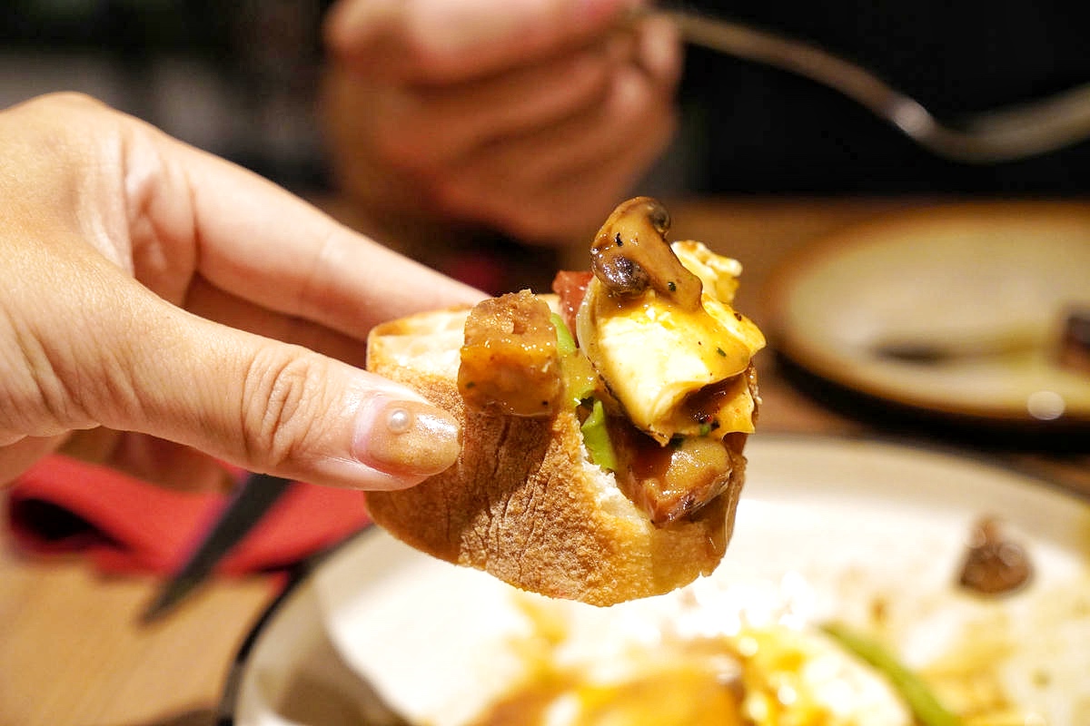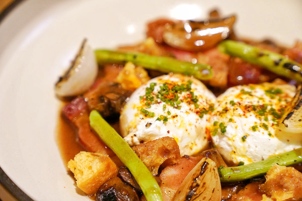 加入了勃根地紅酒牛骨醬,並以培根、麵包丁、洋菇、洋蔥等配料加以燉煮,嚐起來濃厚中帶點微酸香。中間的嫩滑水波蛋當然也是主角之一,用刀輕輕劃開,柔軟濃稠的蛋黃溢出,畫面實在療癒,沾取一旁的濃厚紅酒醬汁一同入口,是令人感動的滋味。