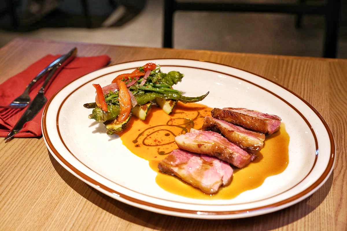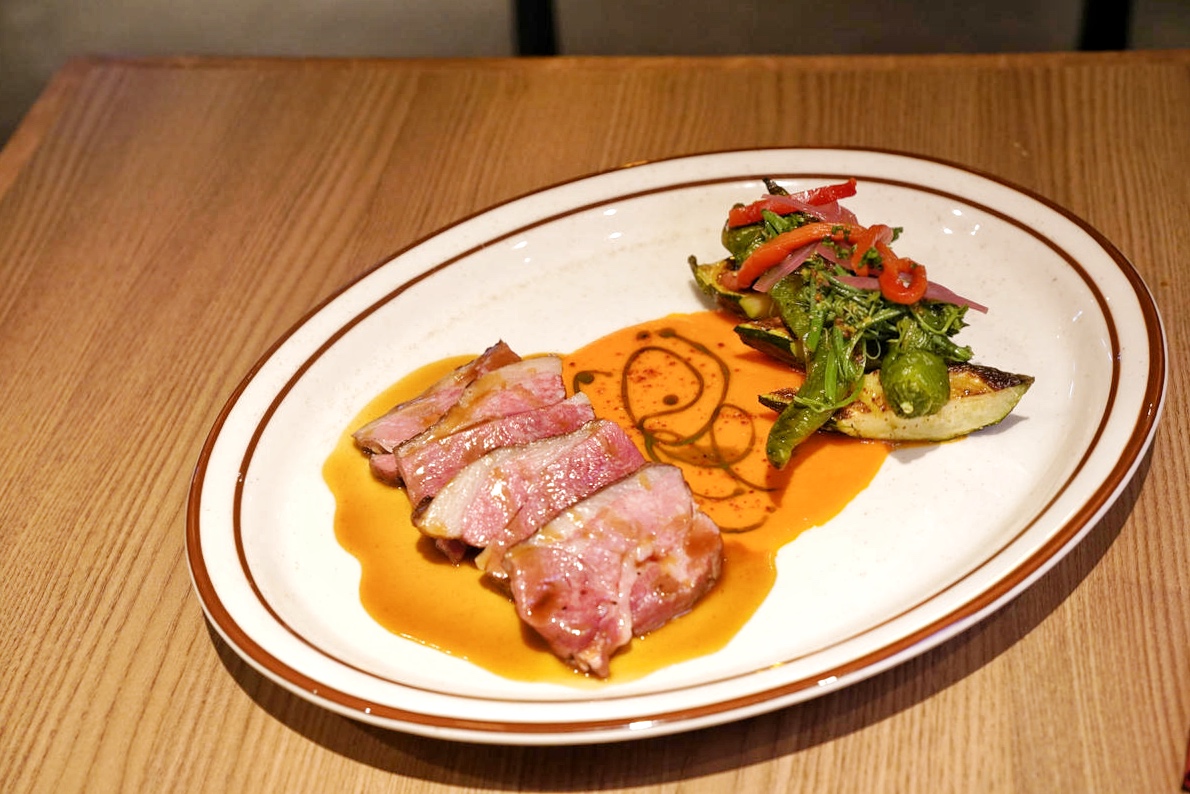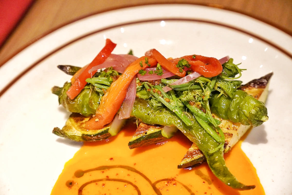 ▼和羊臀搭配的精美時蔬擺盤,有糯米椒、龍鬚菜、櫛瓜、紅洋蔥和甜椒等。