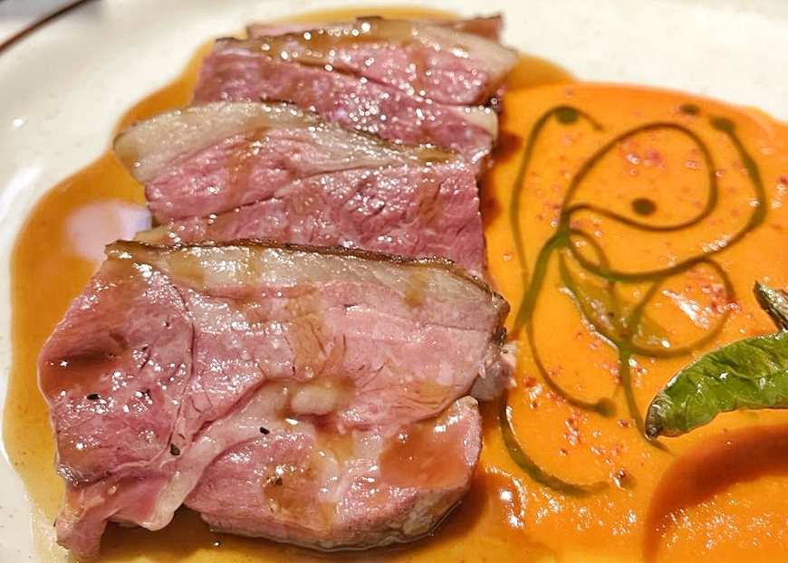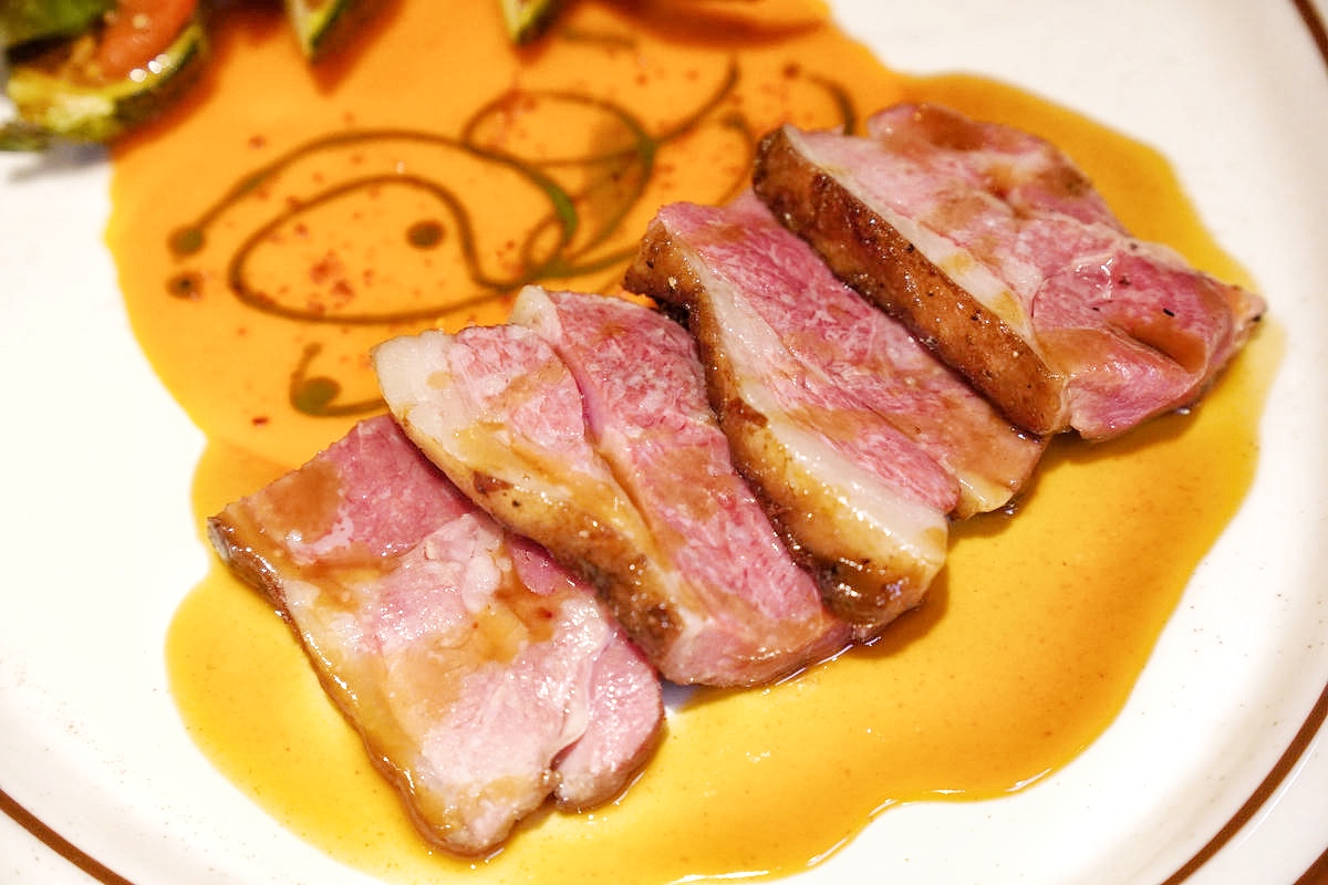 這次我吃到的是和羊臀部位(之前陸續吃過幾個和羊部位,包括羊小排、羊舌等,有著不同口感但都非常好吃),熟度大約為3分,粉嫩的顏色看起來就令人垂涎欲滴,肉質實際吃起來是軟綿至極的口感,柔嫩多汁且不帶血,入口細緻,就感覺快要融化。這軟度、這香氣,我想真的是羊肉的極致了吧!