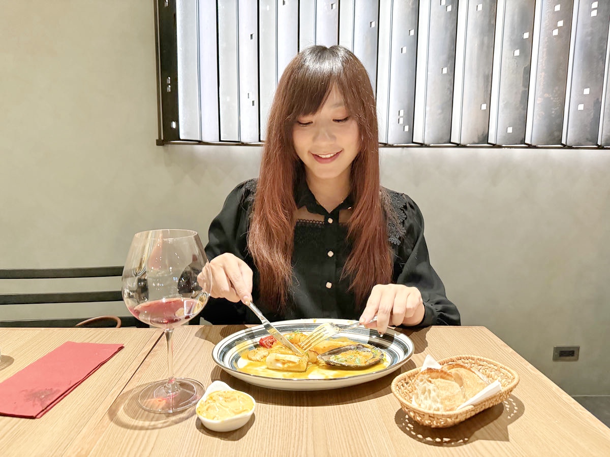 馬賽魚湯中盡是豐富的海鮮用料,石斑、大蝦、透抽和吃起來有如生蠔口感般的大淡菜。另外也加入些許麵包丁,新鮮魚料和麵包充分吸收醬汁,吃起來是濃濃的法式風情。