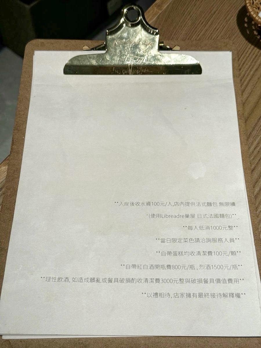 用餐規則為入座後收取水資每人100元,並提供Libreadre巢屋日式法國麵包無限續點。