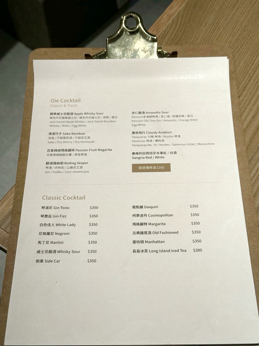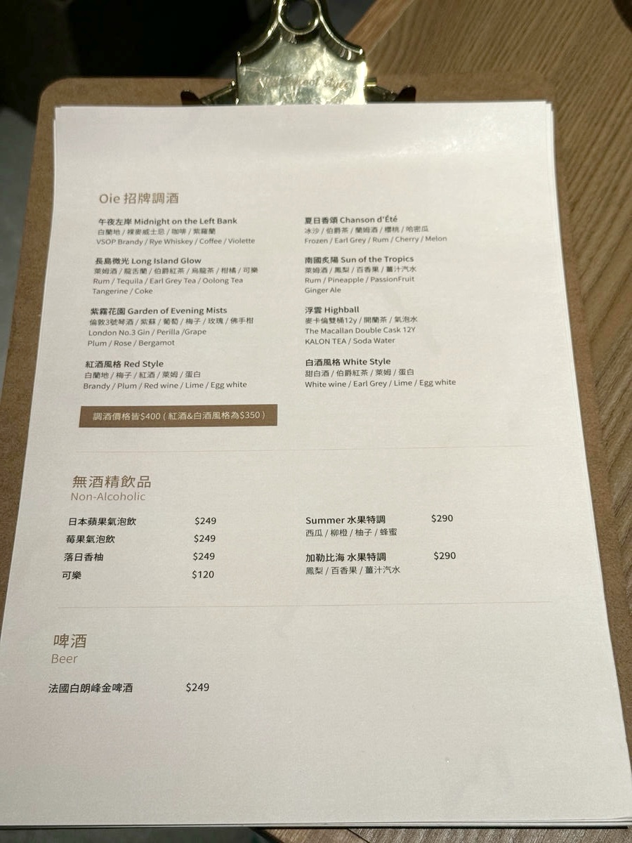「Oie Taipei 」除了法式前菜、主菜外,還有多元酒單,進口世界各地紅酒、白酒、雞尾酒、威士忌,還有特製招牌調酒、無酒精飲品等。
